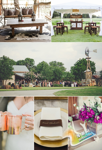 选择一处质朴的乡间农庄,用带鹿角图案的装饰物、铺着牛皮垫的长沙发以及扎成捆的野花布置婚礼现场,浪漫的爱情与野性的自然搭配得恰到好处。客人们可以用铜制的酒杯畅饮特制啤酒或者混合了波旁威士忌的鸡尾酒。