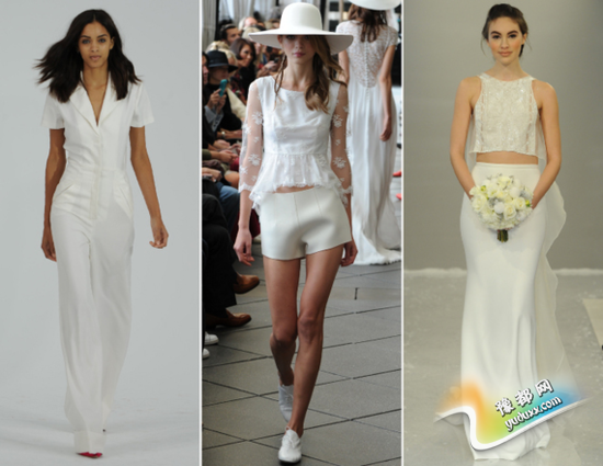 这一季度的婚礼礼服设计增加了许多俏皮的元素。设计师们让传统的婚纱有了新的突破,连体衣、分体裤以及男装风格的礼服都让人眼前一亮。名模奥利维亚 巴勒莫(Olivia Palermo)的短裤套装(中)和Solange Knowles的连体裤(左)在秀场上赚足了眼球。